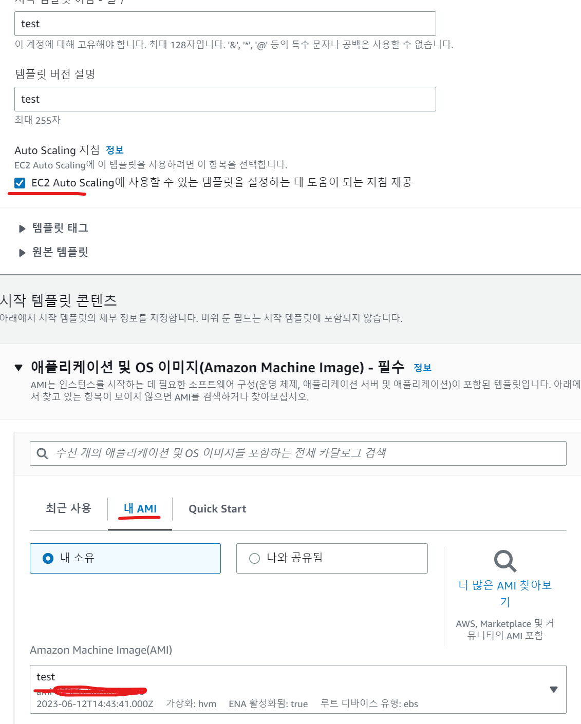 그 다음 오토스케일링 지침 제공에 체크를 하고 아까 만들었던 AMI를 설정해준다.