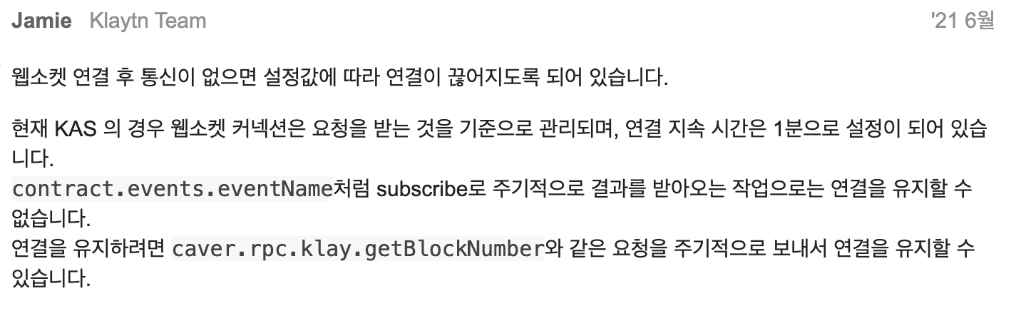 Klaytn에서 WebSocket을 연결하여 스마트컨트랙트에서 발생하는 이벤트를 구독하려고 했다.