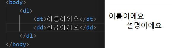 <dl></dl>태그 사이에는 한쌍의 <dt>태그와 <dd>태그를 넣는다